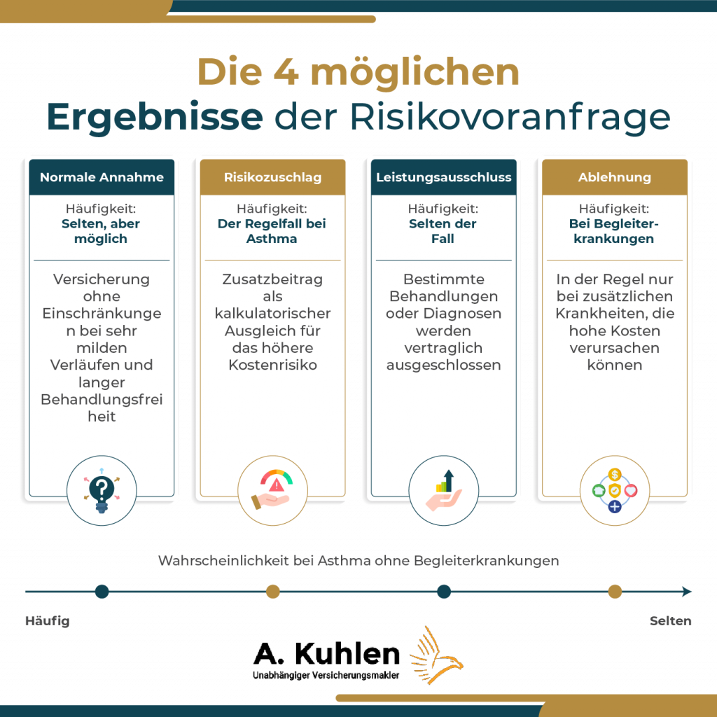 Wegen Deines Asthmas wird Dein Antrag abgelehnt und der Versicherer möchte Dich nicht versichern. Wenn Du lediglich Asthma hast, ist das in der Regel nicht der Fall. Solltest Du jedoch zusätzliche Vorerkrankungen haben, die in Kombination mit Deinem Asthma hohe Behandlungskosten verursachen können, kann das der Fall sein.