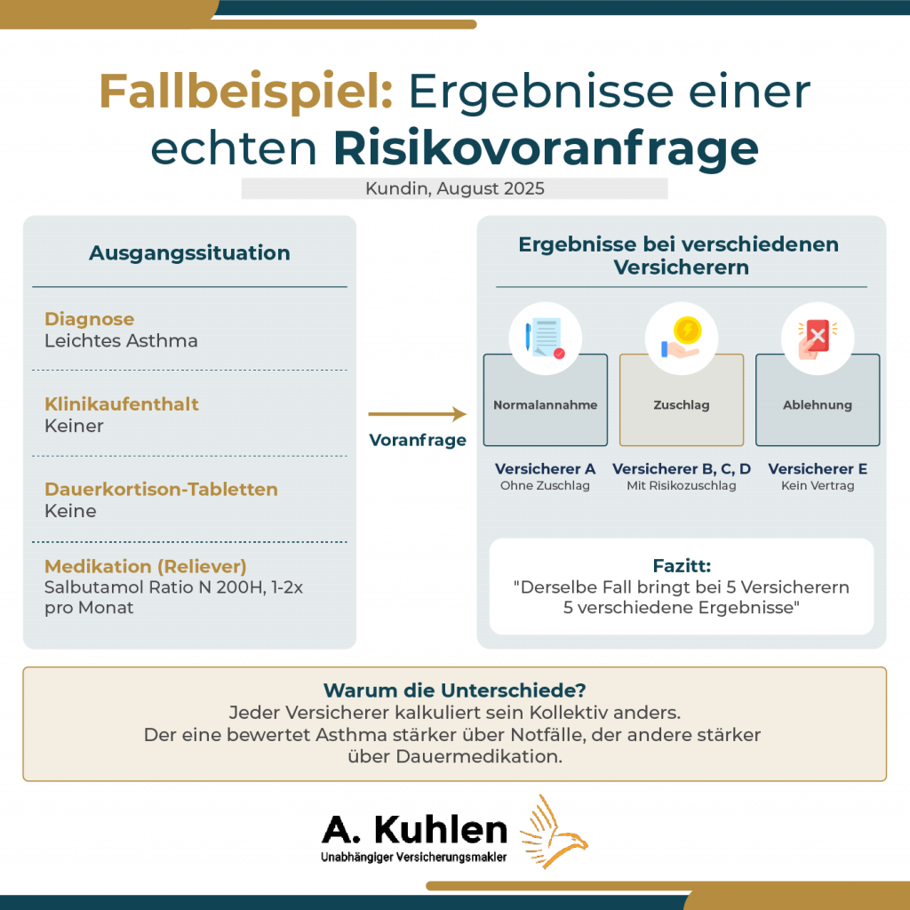 Jeder Versicherer kalkuliert sein Kollektiv anders. Der eine bewertet Asthma stärker über Notfälle, der andere stärker über Dauermedikation. Deshalb ist jeder Fall anders.